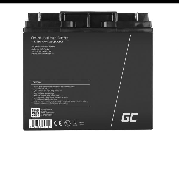 Univerzální 12V VRLA AGM baterie Green Cell s kapacitou 18Ah je spolehlivým zdrojem energie pro záložní napájení, solární systémy, alarmy i elektrická vozítka. Nabízí dlouhou životnost až 5 let, bezúdržbový provoz a snadné připojení pomocí konektoru Faston 250 (F2).