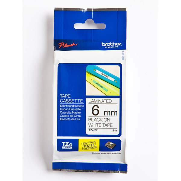 Brother originální páska do tiskárny štítků, Brother, TZE-211, černý tisk/bílý podklad, laminovaná, 8m, 6mm