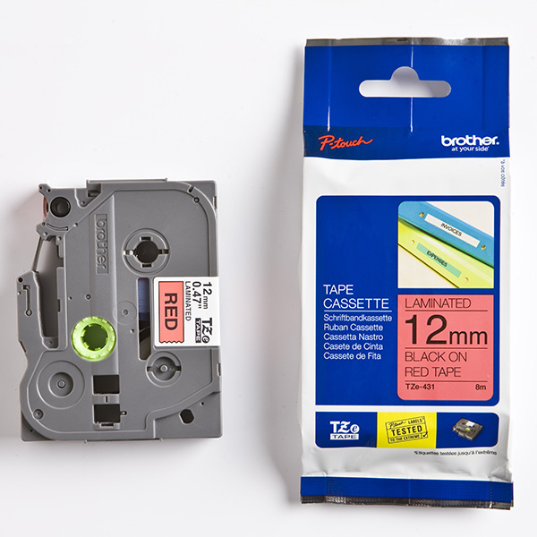 Brother originální páska do tiskárny štítků, Brother, TZE-431, černý tisk/červený podklad, laminovaná, 8m, 12mm