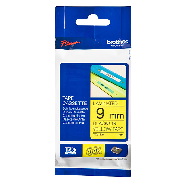 Brother originální páska do tiskárny štítků, Brother, TZE-621, černý tisk/žlutý podklad, laminovaná, 8m, 9mm