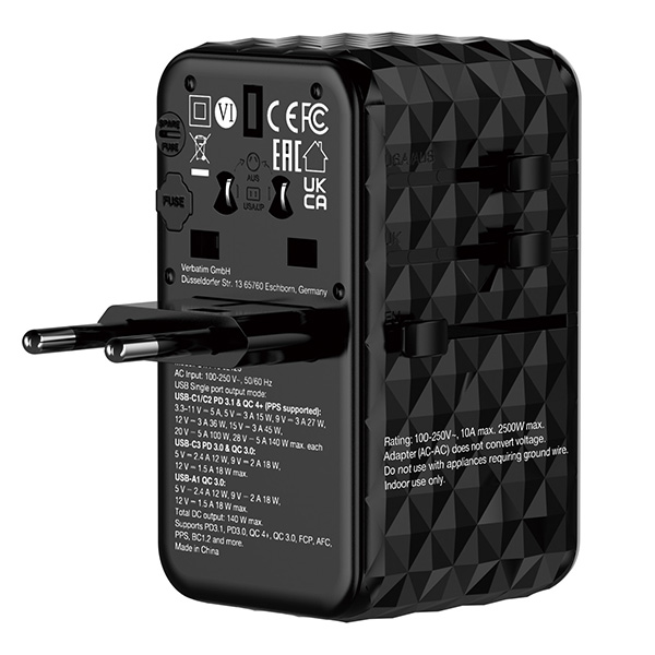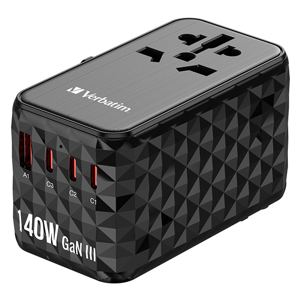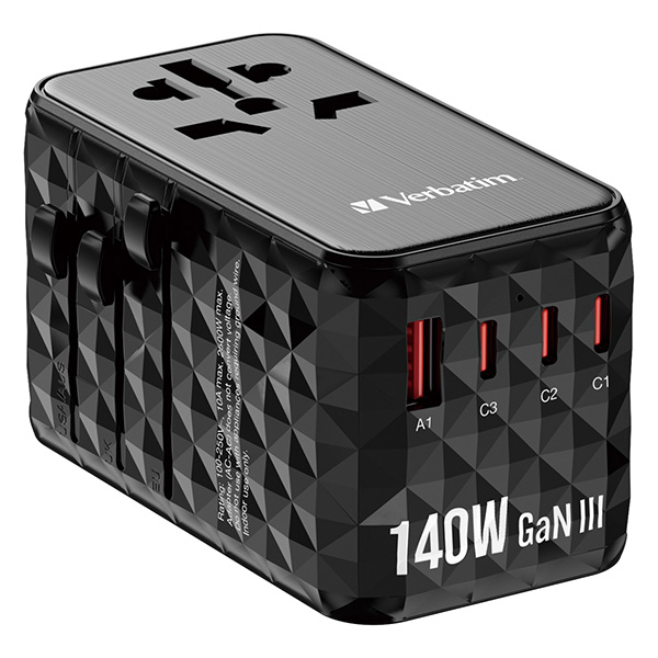 Verbatim, Cestovní adaptér univerzální UTA-10 GaN III 2x USB-C PD a QC 4+, 1x USB-C PD 3.0, 1x USB-A QC, černý, 140 W, poškozený o