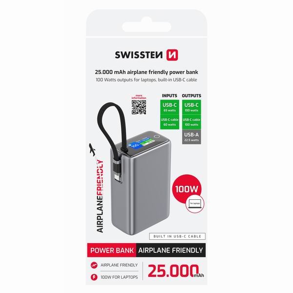 Powerbanka Swissten 25000 mAh (96,25 Wh) je ideálním řešením pro časté cestovatele. Díky kapacitě těsně pod maximálním povoleným limitem pro palubu letadla (27 027 mAh) si ji můžete vzít i na letecké cesty. Poskytuje výkon až 100 W a zvládne nabíjet notebook, tablet i smartphone současně. Vestavěný 25cm USB-C kabel a digitální displej zajišťují maximální komfort a přehled o nabíjení.