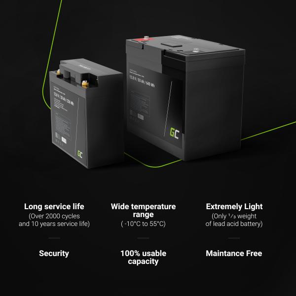 Green Cell LiFePO₄ baterie 12 V / 50 Ah (12,8 V) je moderní akumulátor s vysokou životností, nízkou hmotností a stabilním výkonem. Ideální volba pro fotovoltaické systémy, karavany, obytné vozy i lodě. Nabízí až 2000 cyklů nabití, spolehlivý provoz v širokém teplotním rozsahu a bezpečnou technologii bez rizika přehřátí či výbuchu.