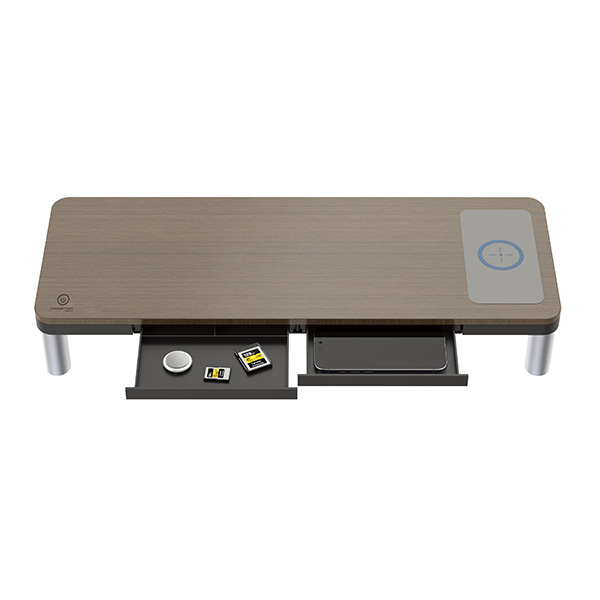 Podstavec pod monitor, dockovací stanice a bezdrátová nabíječka, prostor pro klávesnici, šedý + tmavý dřevodekor, ocel-plast, 20 k