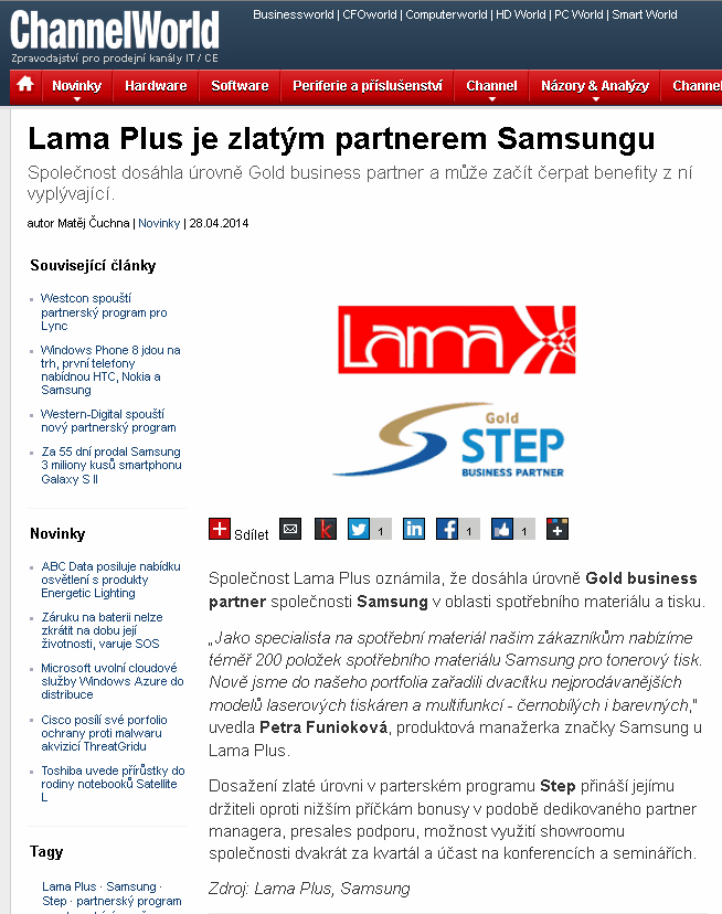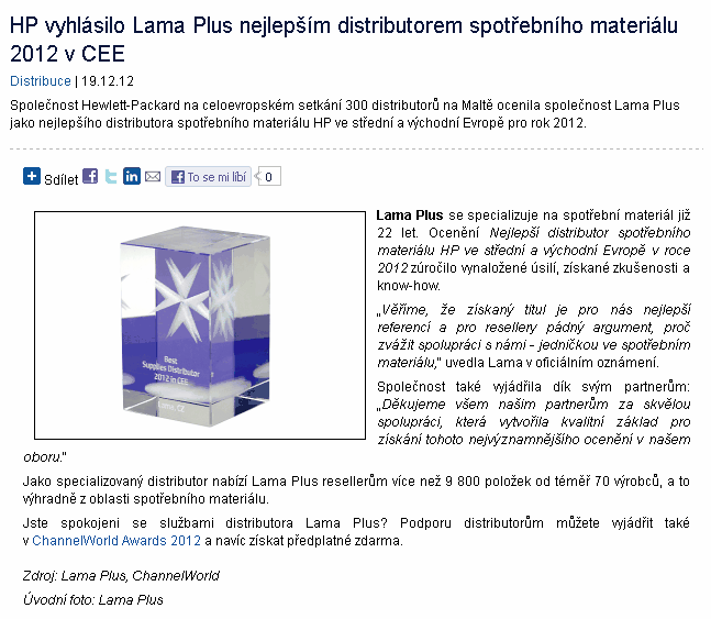 | 12/2012 - ChanneWorld.cz - Lama Plus je nejlepší distributor spotřebního materiálu HP | Náhled (27kB) |