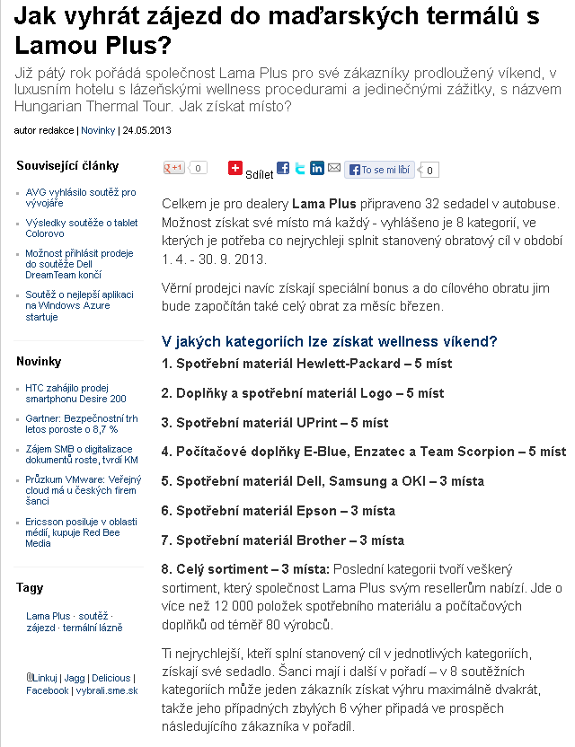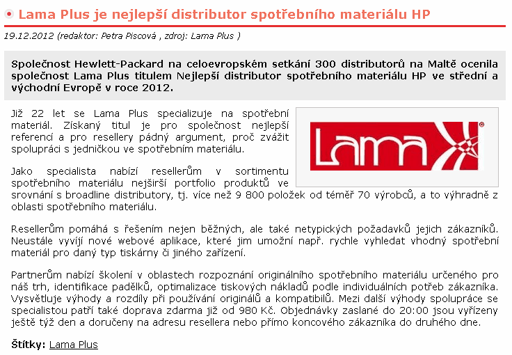 | 12/2012 - Reseller online - HP vyhlásilo Lama Plus nejlepším distributorem spotřebního materiálu 2012 v CEE | Náhled (31kB) |