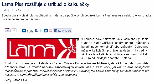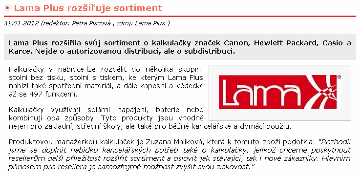 | 2/2012 - ChannelWorld.cz - Lama Plus rozšiřuje distribuci o kalkulačky | Náhled (30kB) |
