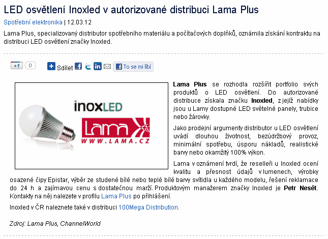 | 3/2012 - ChannelWorld.cz - LED osvětlení Inoxled v autorizované distribuci Lama Plus | Náhled (23kB) |