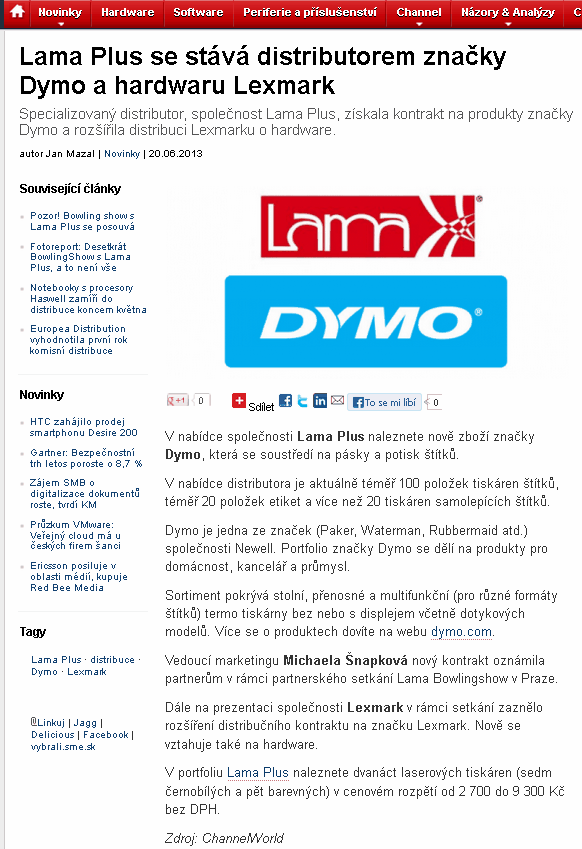 | 6/2013 - ChannelWorld.cz - Lama Plus se stává distributorem značky Dymo a hardwaru Lexmark | Náhled (53kB) |