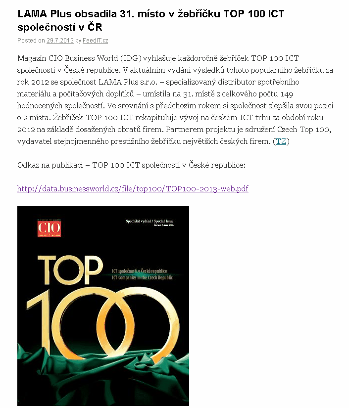 | 7/2013 - Feedit.cz - LAMA Plus obsadila 31. místo v žebříčku TOP 100 ICT společností v ČR | Náhled (68kB) |