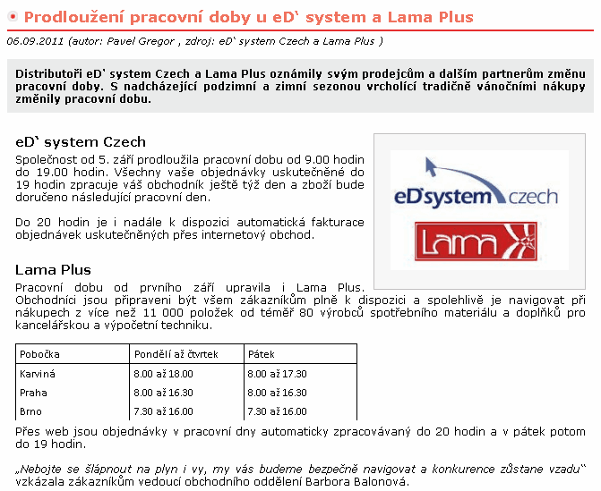 | 9/2011 - Reseller online - Prodloužení pracovní doby u eD system a Lama Plus | Náhled (29kB) |