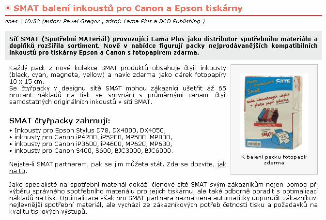 | 9/2011 - Reseller online - SMAT balení inkoustů pro Canon a Epson tiskárny | Náhled (30kB) |